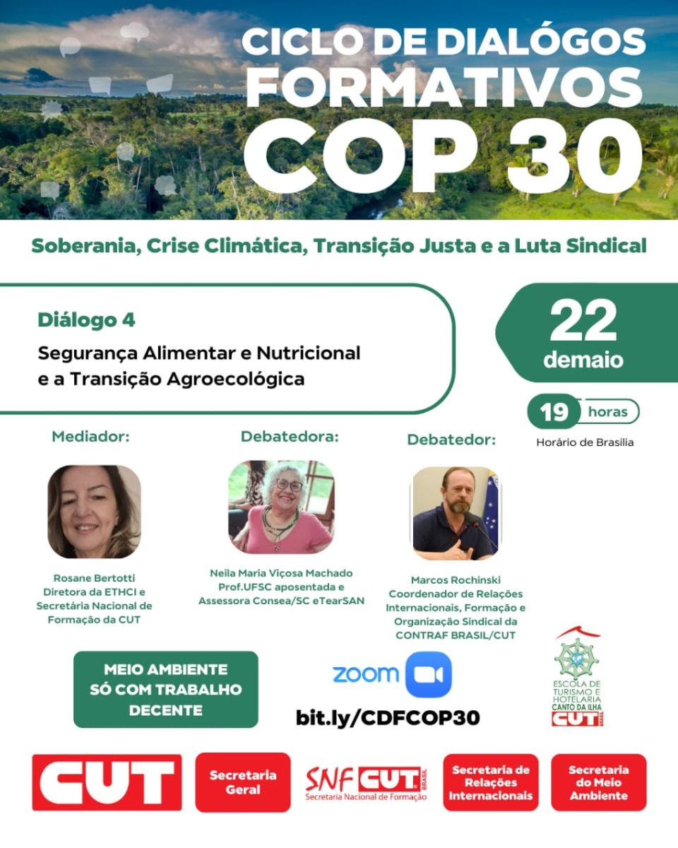 Aconteceu no dia 22 de maio de 2025, das 19h às 21h o 4º Encontro Virtual da COP30 promovido pela CUT sob o Tema: Segurança Alimentar e Nutricional e a Transição Agroecológica. O Encontro foi organizado pelaEscola de Turismo e Hotelaria Canto da Ilha – ETHCI / CUT e teve mais de 100 participantes, dentre sindicalistas de todo o país, convidados e educandos/as do curso qualificação profissional de Gastronomia e Identidade Cultural da Escola.
