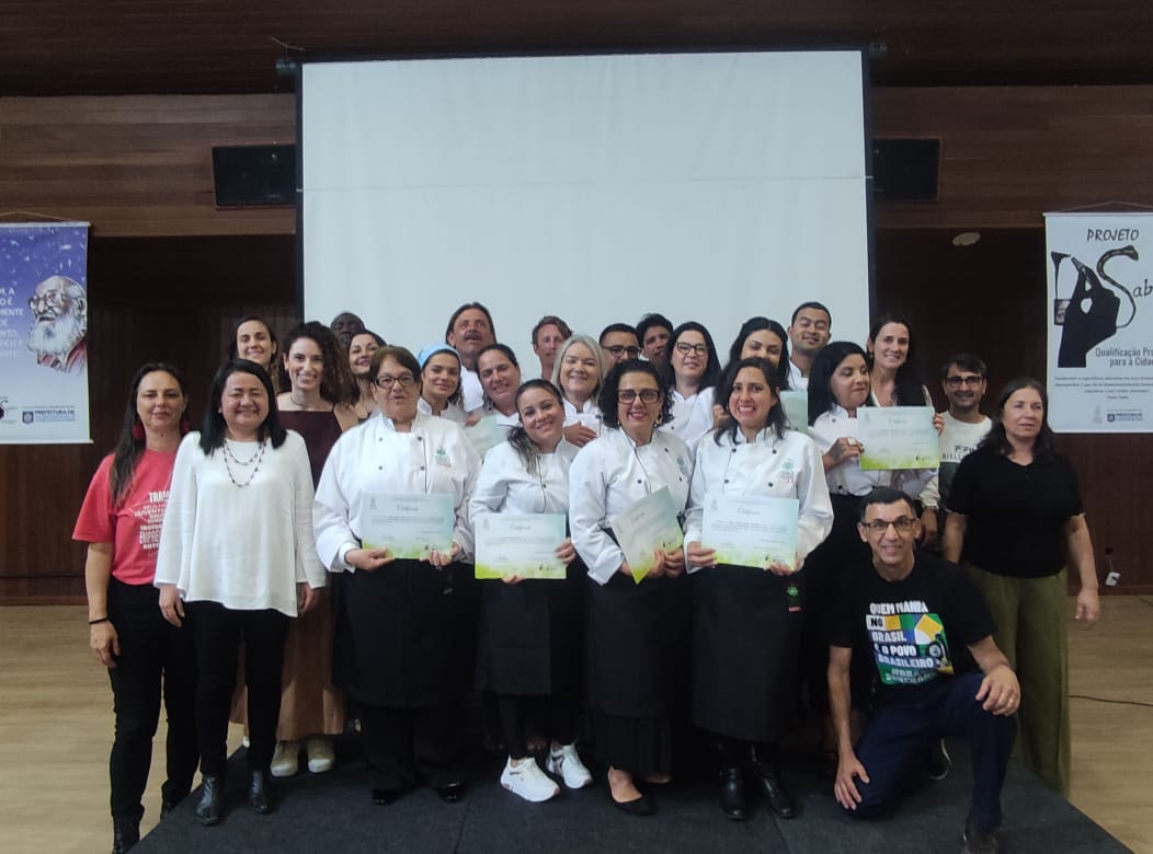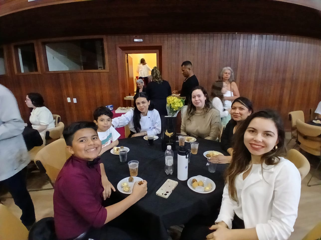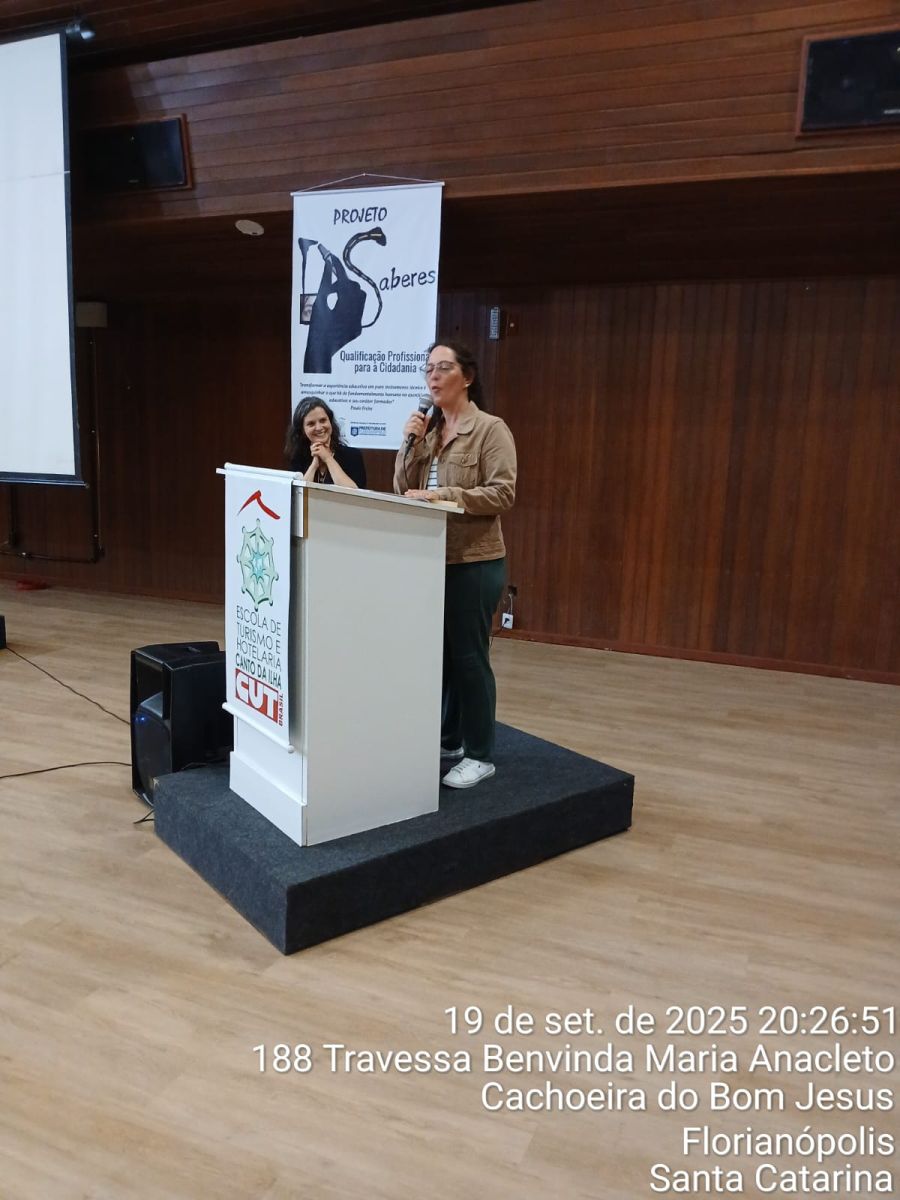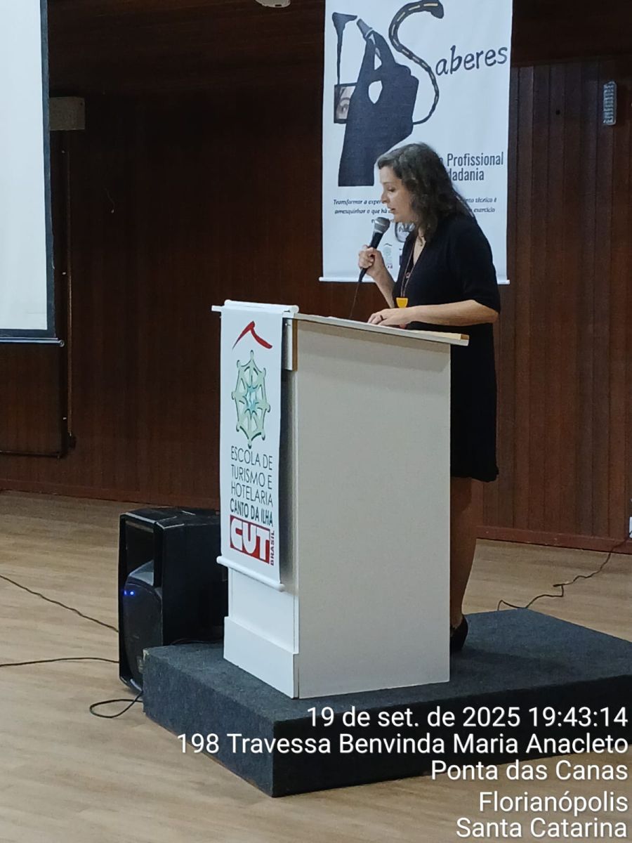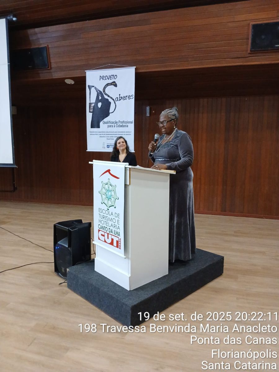 No dia 19.09.2025 (sexta-feira), aconteceu a formatura dos cursos de Gastronomia e Identidade Cultural, Informática Básica e Comunicação e da Oficina de Edição de Vídeo. Estiveram presentes mais de 100 pessoas, entre formandos e seus familiares e amigos e parceiros da Escola de Turismo e Hotelaria Canto da Ilha. Dentre os parceiros da Escola, registramos as presenças da CUT SC, Escola Sindical Sul, Sindicato dos Empregados em Edifícios de Florianópolis – SEEF, Casarão Engenho dos Andrade, representação do Gabinete da vereadora Carla Ayres.